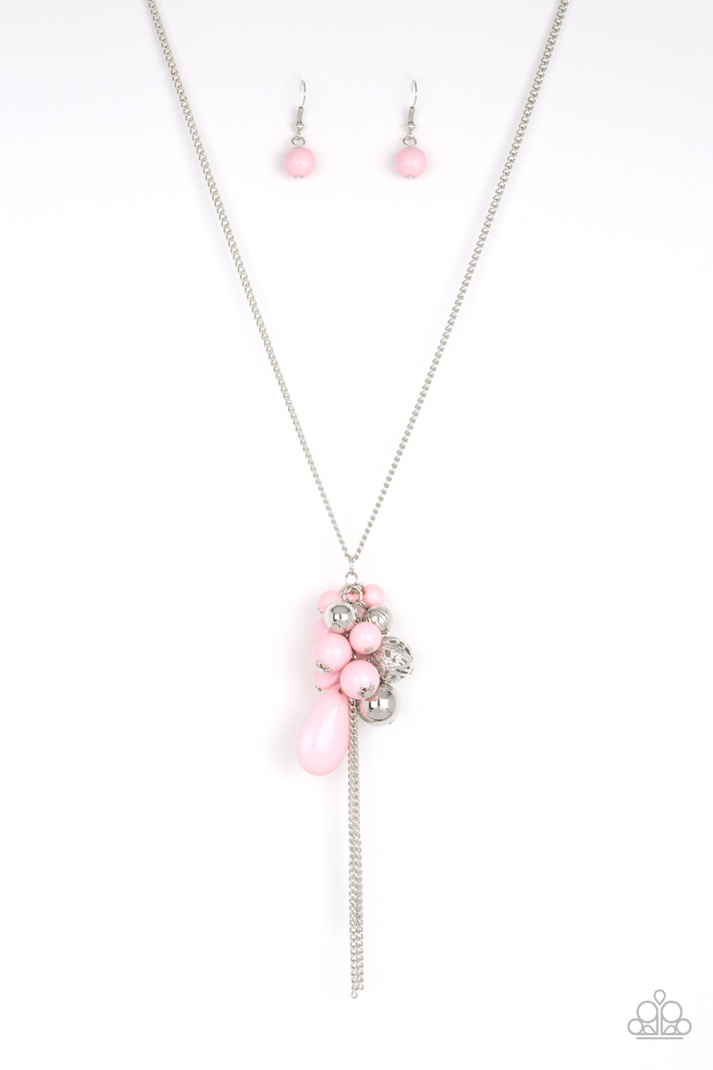A collection of polished pink and silver beads create a colorful cluster at the bottom of a shimmery silver chain. Features an adjustable clasp closure.